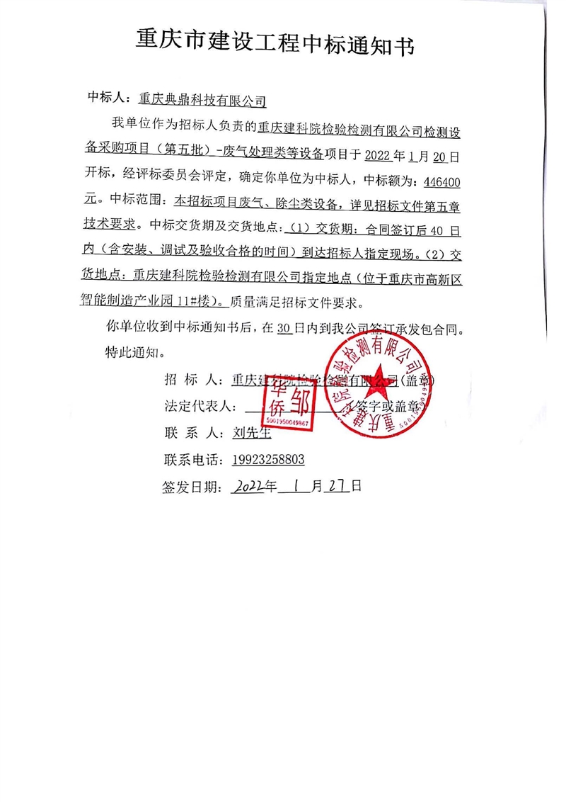 重慶建科院檢驗檢測有限公司委托重慶市工程管理有限公司對我公司檢測設(shè)備采購項目(項目號:CQEM-ZB-22002 )重慶建科院檢驗檢測有限公司檢測設(shè)備采購項目(第五批)-廢氣處理類等設(shè)備進行了公開招標采購,現(xiàn)已完成全部采購程序。確認重慶典鼎科技有限公司為檢測設(shè)備采購項目(第五批)-廢氣處理類等設(shè)備采購項目中標人,中標價為446400元(大寫:肆拾肆萬陸仟肆佰元整)。