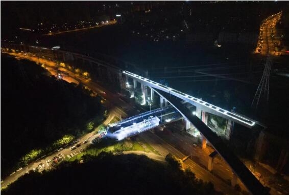為最大程度減少對運營線路的影響,縮短建設工期,保障施工安全,項目部決定采用橋梁轉體工藝進行施工,即在6號線兩側將T構連續梁澆筑完成,以橋墩為軸逆時針轉體,跨越既有6號線進行對接。7月28日1時56分,6號線東延工程劉家坪站至百樂園站高架區間的兩座T構連續梁轉體橋開始轉體施工,經過52分鐘的轉體作業后,實現精準對接,這既是6號線東延工程高架區間首座連續梁轉體,也是重慶軌道交通領域首次實現連續梁跨越既有軌道交通線路轉體,為后續類似施工提供了范本。