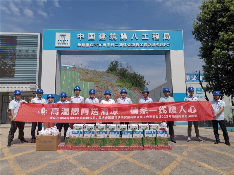 夏日炎炎,高溫酷暑。8月4日上午,重慶設計集團所屬子企業重慶市建筑科學研究院有限公司黨委書記、董事長冉龍彬帶隊赴監理咨詢二公司代建的“重慶市東南醫院二期”項目慰問堅守在項目管理一線的職工,為他們送去清涼與關懷,指導并助推項目建設。黨委辦公室、技術質量安全部和生產經營發展部相關人員陪同慰問。