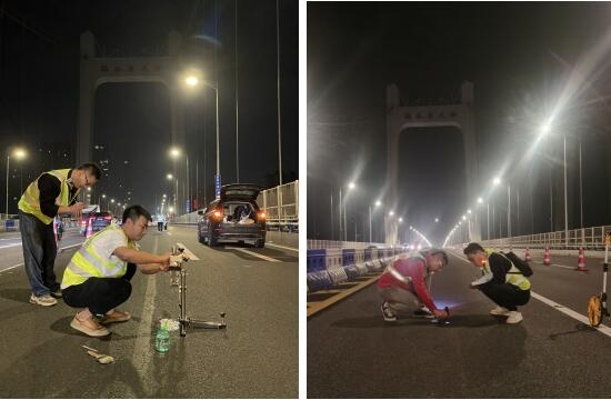 鵝公巖長江大橋是重慶主城區橫跨長江連接九龍坡區和南岸區的重要特大橋梁,是快速抵達成渝高速渝黔高速的主要通道,大橋為雙向八車道,于200012月建成通車。近年來,隨著車流量急速增及重車通行,橋面瀝青鋪裝層產生較多病害,可能影響使用壽命。為全面掌握橋面鋪裝層病害狀況,檢測中心選派豐富經驗的檢測人員提前收集項目資料,協商交通組織方案并編制檢測方案,保證任務順利開展。全體檢測人員高度重視夜間工作的安全問題,布設大量交通導行標牌、施工限速標志等交通設施,全員穿反光背心、佩戴安全警示燈進行病害分布、平整度、摩擦系數、構造深度等指標的檢測,確保數據的真實性和準確性。最終檢測數據和狀況評估以報告編制工作會的形式發布,為鋪裝層病害專項整治專項設計提供了技術依據,為后續的橋面鋪裝層病害整治方案制定提供了科學支撐。