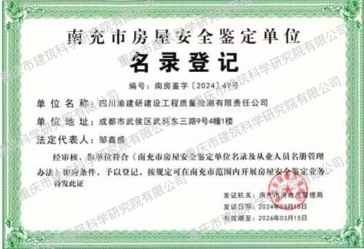 該項名錄登記單位資格的取得,標志著四川渝建研公司在房屋安全鑒定領域的專業(yè)資質和實力得到了南充市相關部門的認可,公司將有更多機會參與到南充市各類房屋安全鑒定項目中,為更多客戶提供專業(yè)、高效的服務。