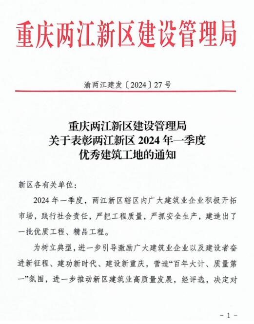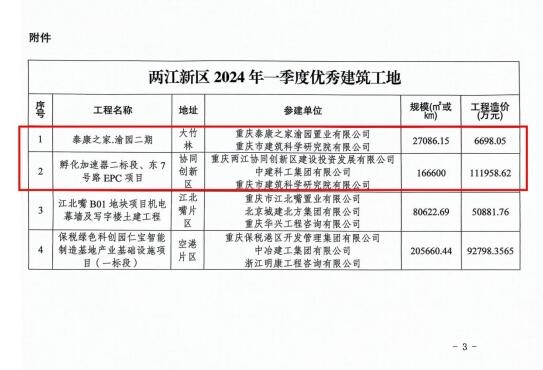近日,由重慶設計集團市科院公司承擔監理的泰康之家·渝園二期項目以及孵化加速器二標段、東7號路EPC項目在眾多建筑工地中脫穎而出,獲重慶兩江新區建設管理局2024年第一季度優秀建筑工地表彰