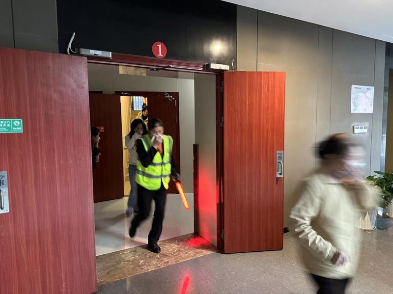 理論培訓(xùn)現(xiàn)場,一陣急促的警報聲突然響起,火災(zāi)緊急疏散演練正式開始。模擬火災(zāi)場景設(shè)定為辦公區(qū)因不明原因起火,引燃周邊可燃物,致使火勢迅速擴(kuò)大,并向樓層四周及建筑上層蔓延。現(xiàn)場工作人員發(fā)現(xiàn)火災(zāi)后,立即按下火災(zāi)報警裝置并按報告程序,建科大廈火災(zāi)警報、消防卷簾門等消防設(shè)施瞬間聯(lián)動。應(yīng)急領(lǐng)導(dǎo)小組收到報告后立即啟動消防應(yīng)急預(yù)案,各應(yīng)急小組各司其職,火速奔赴現(xiàn)場展開搶險。在樓層安全員的精準(zhǔn)指揮引導(dǎo)下,各樓層員工快速反應(yīng),沿著正確的疏散路線有序撤離至安全集合點(diǎn)。