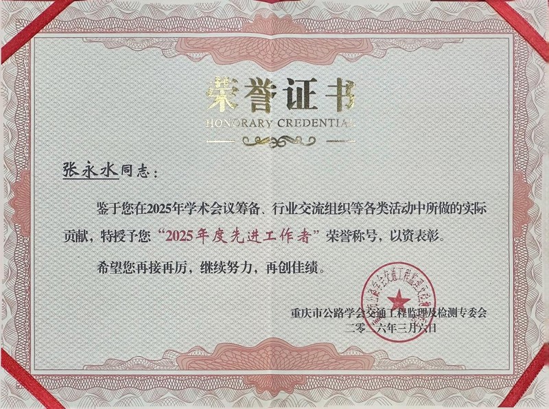 近日,重慶市公路學(xué)會交通工程監(jiān)理及檢測專業(yè)委員會第四屆會員大會暨學(xué)術(shù)交流會成功舉行。會上,重慶設(shè)計集團市建科院所屬子企業(yè)重慶交大建設(shè)工程質(zhì)量檢測中心有限公司被授予“2025年度優(yōu)秀會員單位”稱號,公司技術(shù)總監(jiān)張永水榮獲“2025年度先進工作者”榮譽稱號。